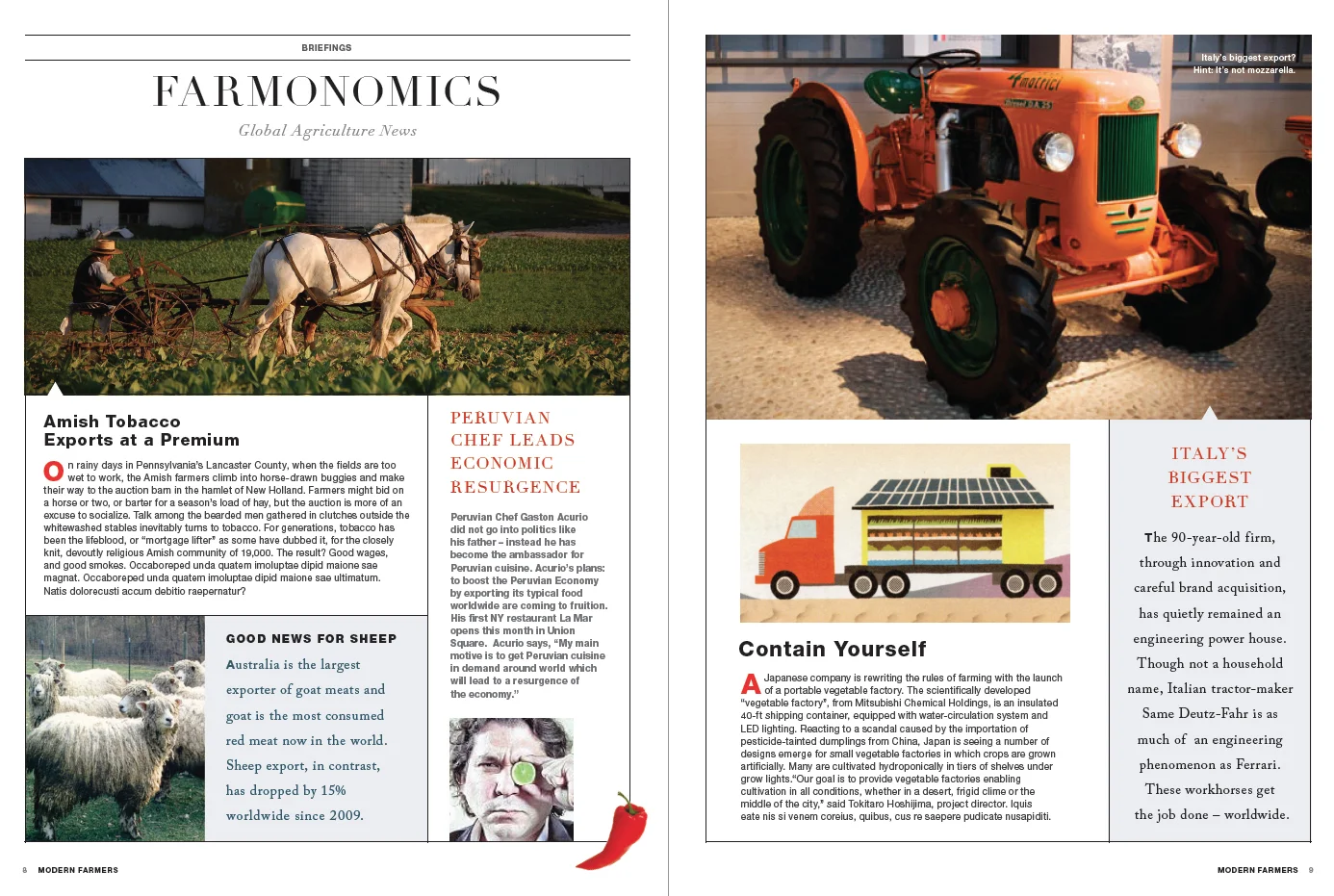 Design of the first full prototype of Modern Farmer magazine with founding editor Ann Marie Gardner. We brainstormed ideas for columns, features, branded products, partnerships and marketing concepts, as well as business plan to present to investors. We suggested using a farm animal as the last page of the magazine, a concept that became the front cover of every issue. With Pirtle Design.
