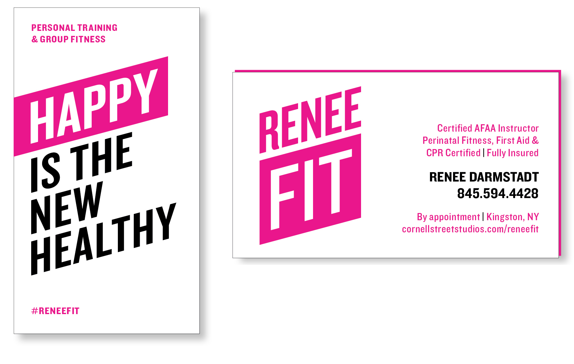 Logo and business cards for Renee Fit, the personal training and motivational fitness brand of Renee Darmstadt.